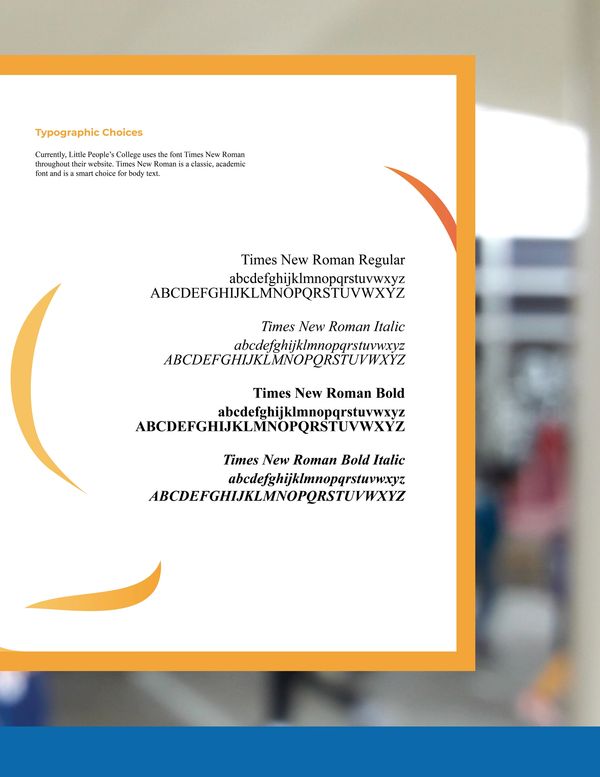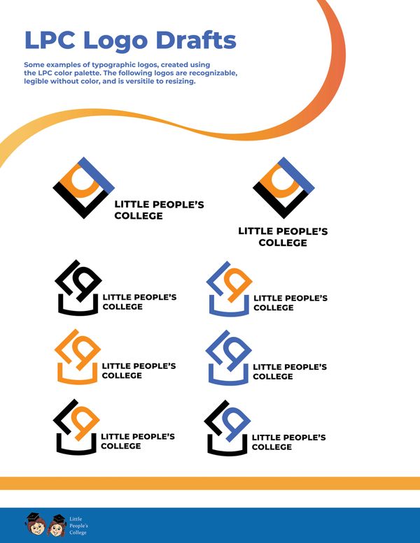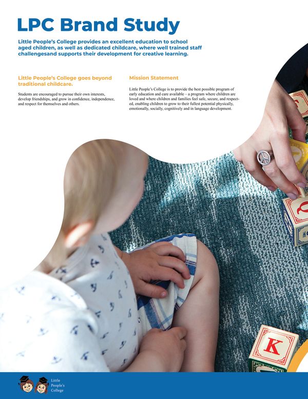 I was assigned to create a proposal for the rebranding of Little People's College. This proposal would include a thorough brand study, as well as a new logo and accompanying branding guidelines.